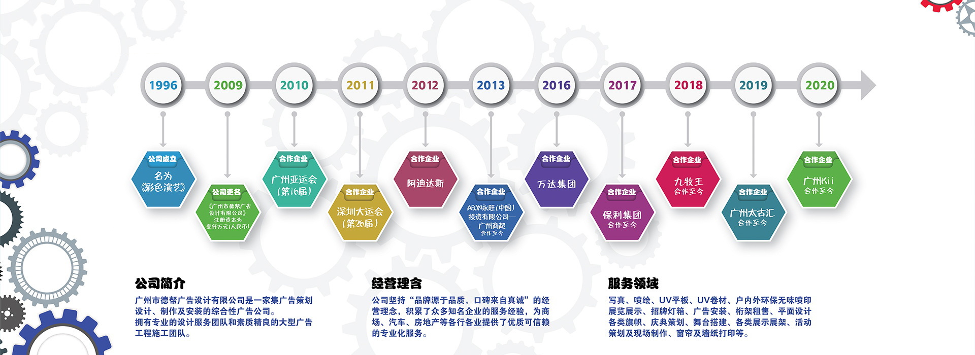 廣州市德幫廣告設(shè)計(jì)有限公司,是一家集廣告策劃 、設(shè)計(jì)及制作安裝于一體的綜合性廣告服務(wù)商,公司(原彩色演藝噴繪)成立于1996年,公司擁有惠普、愛普生戶內(nèi)外寫真噴繪機(jī)20臺(tái),HP latex環(huán)保乳膠墨水打印機(jī)2臺(tái),大噴機(jī)10臺(tái),UV平板卷材機(jī)6臺(tái),全自動(dòng)智能切割機(jī)4臺(tái)等高端設(shè)備,專業(yè)的設(shè)計(jì)制作團(tuán)隊(duì)和素質(zhì)精良的大型廣告工程施工團(tuán)隊(duì),廠房面積達(dá)3000平米。公司主要經(jīng)營戶內(nèi)、外寫真、噴繪、廣告工程的制作、平面設(shè)計(jì)、燈箱、招牌等業(yè)務(wù),公司所有的設(shè)備采用進(jìn)口設(shè)備、后期制作自動(dòng)化,生產(chǎn)速度快、質(zhì)量第一。與方圓地產(chǎn)、萬達(dá)廣場、招商地產(chǎn)、萬科地產(chǎn)合作,主要制作內(nèi)容:廣告活動(dòng)物料、圍墻的生產(chǎn)、安裝、桁架的搭建、活動(dòng)執(zhí)行、高空安裝、燈旗的制作及安裝等業(yè)務(wù)。公司先后榮獲廣州地區(qū)十佳廣告工程制作公司、中國商務(wù)廣告協(xié)會(huì)廣告工程分會(huì)會(huì)員單位、全國噴繪企業(yè)入圍品牌公司等諸多榮譽(yù)。至今已發(fā)展成為華南地區(qū)大型的廣告產(chǎn)品供應(yīng)基地。并以“產(chǎn)量高、質(zhì)量好、交貨快”的經(jīng)營模式贏得了廣大客戶的稱贊。并堅(jiān)持“品牌源于品質(zhì),口碑來自真誠”的經(jīng)營理念,積累了眾多知名企業(yè)、政府機(jī)構(gòu)的服務(wù)經(jīng)驗(yàn),為大型活動(dòng)、商場超市、汽車、房地產(chǎn)等各行業(yè)提供了優(yōu)質(zhì)可靠的專業(yè)化廣告服務(wù)。旨在協(xié)助客戶提升品牌形象,并以建立長期品牌價(jià)值為使命,讓各行業(yè)的品牌形象結(jié)合產(chǎn)品推向市場,贏得足夠的社會(huì)關(guān)注,幫助企業(yè)品牌成長。